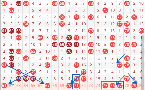 本期的61 67我们要注意一下,出一个号码的情况很大,重点考虑一下67的出号情况。本期的70号数字我们也是要注意一下的,上期71 72同出,那么本期的70号数字就很容易被带出来的。本期的76 77我们要注意一下,出一个号码的情况还是很大的。