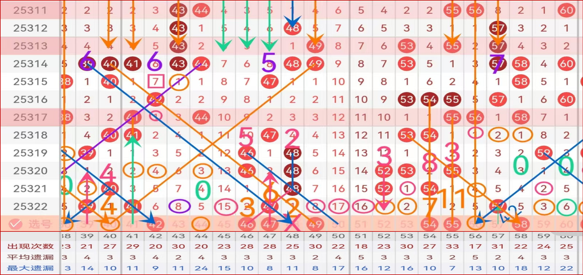 三区间推荐主做号码:42 46 49 54 55 58 防守号码 :44 53 56 59;