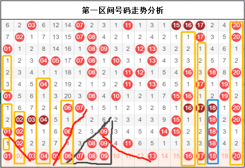 第一区间号码01-20,第一区间注定是个不甘于寂寞的区间,如图所示,上一期08如约出现,似乎又一下子激活了空间密码。从目前的走势图上我们呢可以看到很多走势已经昭然若揭,只是不知道这种路人皆知的走势会不会玩出个新鲜来。但有一点可以肯定的是,一区最近走势确实有点太火了,会不会乐极生悲爆冷了。