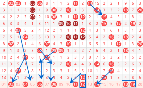 该区间的02 05号数字本期我们要注意一下,02号数字和03 04形成三斜连,05号数字和03 04形成三斜连,应该会出一个号码来。本期的中心对称回补号码06 07 08我们要重点注意一下,本期应该要出号了。本期的11号数字我们要注意一下,上期开出12号数字很可能会把11号数字拉出来。
