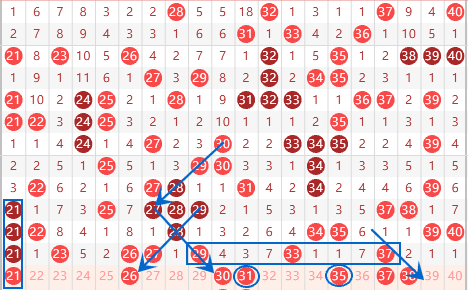 本期的21号数字我们要注意一下出4重的情况,做防守就可以了。本期的连号空一带号26 27 29本期我们要注意落下重号的情况。本期的31 35我们也是要注意的,都是空三中心号,出一个的可能性很大。本期的37 38号数字我们也可以关注一下,出一个的机会也是很大的。