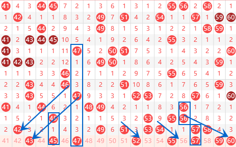 本期的43号数字我们可以考虑一下,它跟上期的42号数字走势是一样的,和45 47形成3斜连号码,可以小做一下。本期的47号数字是空三对称,可以关注一下。本期的57号数字我们要注意走重的情况,前面期数中走过这样的号码。本期的59 60我们也是要注意一下的,出一个号码的机会很大,重点关注一下60号数字。