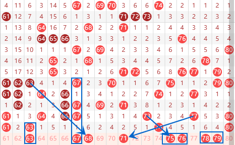 该区间的63号数字我们要关注一下走重的情况,它是属于冷号回补,出重号的机会还是很大的。本期的67号数字我们可以关注一下,属于空一对称形态。本期的71号数字我们也是可以关注一下的,走势是属于3322走势,出号机会还是有的。本期的75号数字是属于三斜连号码,也是可以关注一下的。