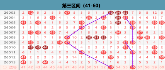 本区上期开出2码的区间布局,那么在本期我们优先考虑的就是41 44的同路的出号点位,在这个位置上我们优先考虑的就是分边的出号点位,40 42 43 45的位置上我们做择一的出号选择,在空位上我们关注的是46的同尾的回补点位,49的同尾以及同路放空的点位,53 60的同形态的放空点位,56的同路放空的点位,但是5头是断头的区间出号,那么在这个位置上我们不能考虑太多码的出号,所以我们在这几个回补点位上的重点考虑的出号,这个位置上我们是要考虑容错的出号点位的,那么其他位置上的出号就不是我们重点考虑的位置了。