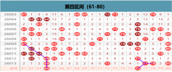 本区上期开出5码的区间布局,那么在本期我们还是先把形态分类,72 80的孤码同形态的出号,77 80的同路的出号点位,那么在这个位置上我们优先考虑的就是72 80的出号点位,在这个位置上我们优先考虑的就是做择一的出号的选择,做一放一的出号上,在同路的位置上我们优先考虑的就是分边的出号点位,在空位上我们关注的就是68 69两个同路下方的回补重点位置,在这个位置上我们优先考虑的就是67 68 69的位置上我们做择一出号的可能性,那么其他位置的出号就不是我们考虑的重点位置了。