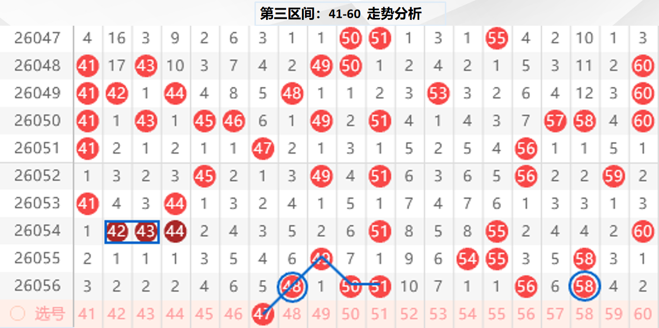 三区分析:【41-60】(走势图标注号码非小黄车大底,请谨慎参考,具体思路将在直播间分享讨论)