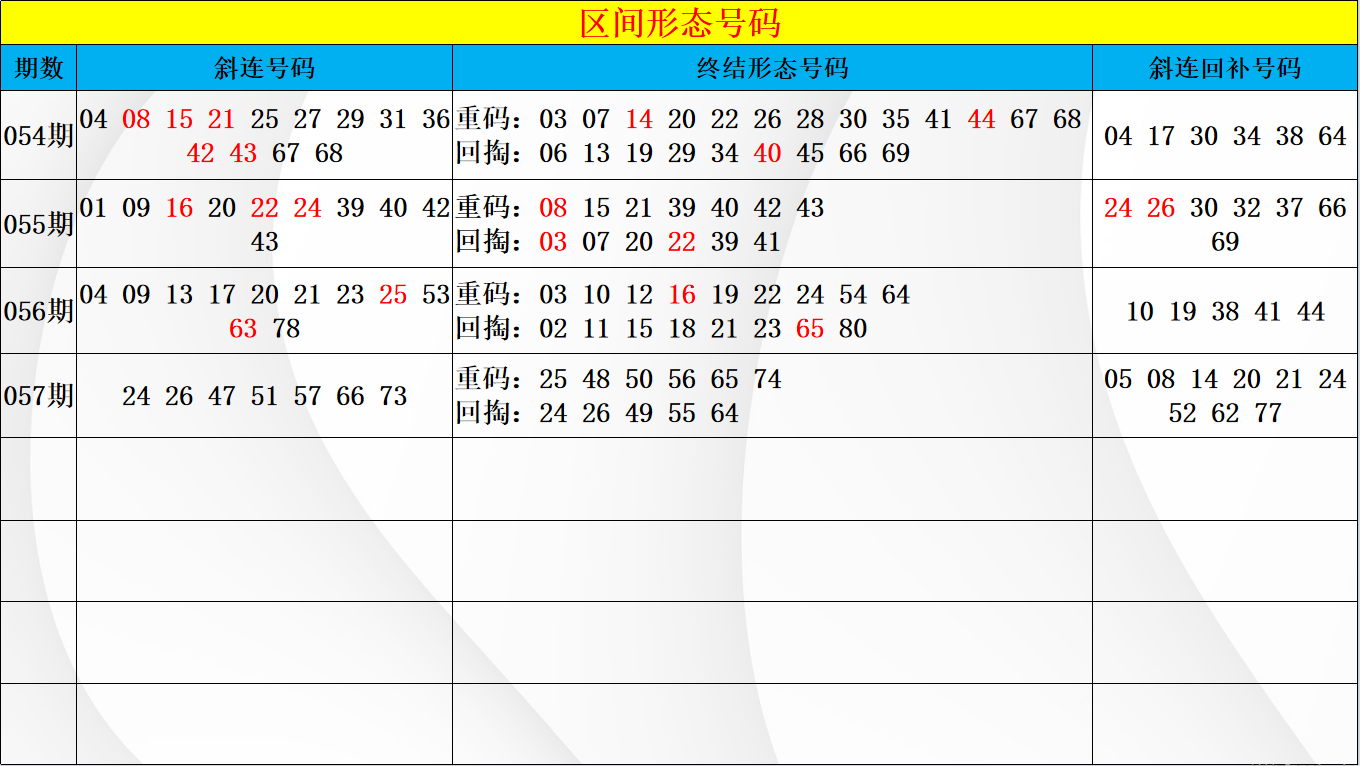 上期三区的开号中在回补接力周期上继续保持着出号重点,号码在重码的形态中开出58,区间在温冷的周期对应上也是以形态的分边开出重点,空位中的小周期保持出号上的重点。从本期的重点布局上考虑,区间在形态上还是要重点考虑重码的接力出号位置,号码中以双分的出号模式以及在空位形态上还是要判断重点,对应号码在48 50 58三码中关注出号选择。而在区间的温冷周期做回补重点上也要考虑在48 52 57三码中的判断重点,号码以接力分边的形态上还是要重点考虑接力出号的机会,但空位中以连续三期的开号模式也要防守46 53两码中的开出机会,防守择一布局即可。从空位中判断,区间在小周期上同样是关注的重点,小周期对应号码在42 43 44 45 54 60六码中,以同形态做两期的回补点位上可优先关注60的回补模式,以及在前区封口的回补中也要考虑42 43 44的开号重点,区间在空位周期的出号上开出的机会还是非常大的,注意形态对应的放空回补选择。
