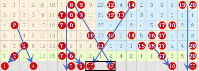 上期开出了龙尾80号数字,本期的龙头1号数字可以关注一下,而且它又与2 3号形成3斜连。4号数字与2 3号数字形成空一三斜连,感觉1 4号数字之中应该有一码要开出来的。近期的8号数字出号就是出重号,本期我们必须要防一下的。上期以11 15号为中心对称的10 12 14 16号数字没有开出来,本期有很大的几率要出号了,可以选一胆码了,参考10 12 14号数字作战。18号数字和16 17号数字形成了3斜连,可以关注一下。