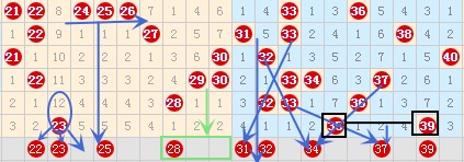 上期开出的23号数字属于冷号类型,又是一个孤号,所以本期的22 23 24号数字很看好出一个数字,也可以在这里定一胆码的。24 25 26号数字已经同时遗漏5期了,近两期内必定要落号了,本期我们先防守一下,如果本期不落号,那么下期我们就可以在该处定胆码了。在23号到35号数字之间都是有同期遗漏值的,我们就主要参考24 25 26 29 30 31 32 33号应该会开出3个号码数字,可以重点作战。37号数字是35 39号数字的空三中心号,上期的空三中心已经开出来了,所以本期的空三中心号37 63号数字我们就做防守号用吧。