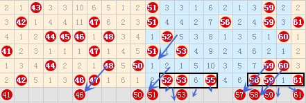 上期开出的46 47号这个连号本期有落号的希望,毕竟上期在41-50号数字区间开出了3个号码,出重号的概率很大的,这里我们就参考46出重号吧。52 53 55号和58 59 61号都是连号空一带号类型的号码组合,这种号码组合是最容易落重号的,可是这里有两组,应该有一组是要断号的,有点难判断是那一组,我们就先参考53 55 58 61号数字,在从这里面选一胆码出来。