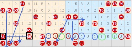 62号数字以前面的63 64号形成了空二3斜连,也可以关注一下。61 63号数字前面已经分析过了,这里就不说了。67号到80号数字之间有三组同期遗漏值的数字为68 73 75 号和69 71 72 号及70 76 78号,这里我们重点关注68 69 72 73号数字的出号情况,也可以在这里选一胆码的。本期分析中有4组三连号为8 9 10号和57 58 59号及61 62 63号还有67 68 69号。比较看好57 58 59号及67 68 69号数字出连号,不知道能不能开出来。好了,本期分析就到这里了。