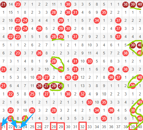 39: 如走势图,39在近15期内开出4次,每次都与40捆绑出现,上期又开出40,本期看好S型走势,39继续左斜连下来。
