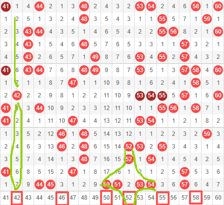 三区推荐号码为:42, 46, 50,52, 55, 58.