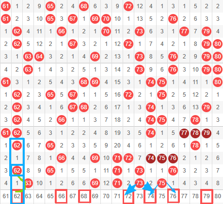62: 62不用多说,如图,是大盘大热号,前几期更是开出5连红,上期开出邻号63,间隔一起,本期可以无脑追62.