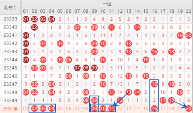 该区间的连号空一带号01 02 04上期没能出重号,本期我们注意一下回补号码的情况,重点关注一下02 04号数字回补的情况。上期开出了08 09号数字,本期我们注意出一个重号的情况。本期的10号数字也是属于复制号码,但是太过于热了,本期我们就做一下防守就行了。本期的11号数字是属于三斜连号码,我们可以关注一下。本期的16号数字我们注意一下出号情况,本期的出号机会还是有的。