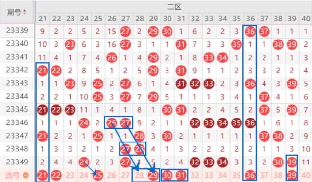 本期的21号数字是属于121走势,本期我们注意一下出号情况。本期的22号数字是属于424走势,出号机会还是有的。本期的25号数字是属于空二对称号码,出号机会也是有的,我们要注意一下。本期的28 29号数字我们注意一下出一个号码的情况。上期开出了32 33 34号数字的连号,本期我们防守一下断号的情况。本期的36号数字我们防守一下就行了。上期开出了38 39号数字的连号,本期我们注意出一个重号的情况。