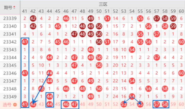 该区间的41号数字是属于空三对称号码,本期是有机会出号的。本期的44号数字我们注意一下走从的情况。本期我们注意一下46 47出一个号码的情况,重点关注一下46号数字的出号情况。上期开出了54号数字,本期我们注意一下走分边的情况。本期的57 58号数字我们注意一下同出的情况,做一下防守是最好的。