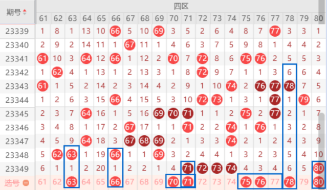 上期的连号62 63号数字没有开出重号来,本期我们要注意一下落下一个号码的情况。重点关注一下63号数字,它是属于919走势,出号机会还是有的。本期的66号数字我们注意一下出号情况,该区间的遗漏1期的号码有4个,本期应该是要出一个号码,所以这里我们可以重点考虑一下。上期开出了71 72 73 74号数字的4连号,本期我们要注意出重号的情况,重点关注一下71 73号数字出一个重号的情况。本期的75 76 77号数字我们要注意回补一个号码的情况,重点考虑一下75 76号数字的出号情况。