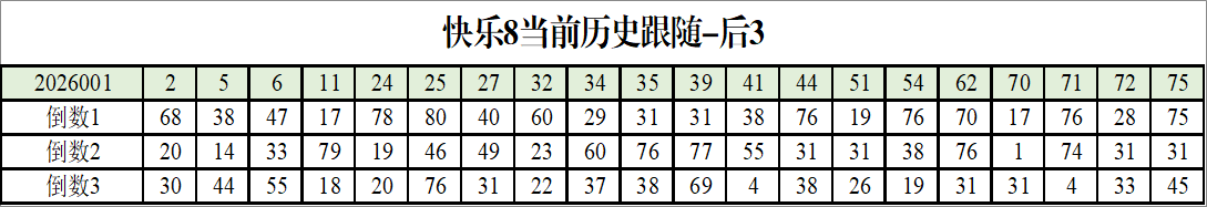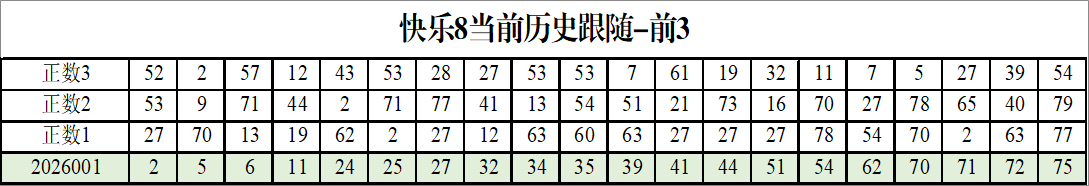 我感觉选热的同时,还要注意防冷条件开出,可以直接选取每个号码跟随出次前三的号码,也可以考虑把出次最后的三个数字加进去,不过这样可能号码太多,可以尝试。图上也能看出单独号码跟随的情况,我就不一一统计每个号码的出次了,我这里考虑提高概率,取每个号码历史跟随的前三号码和后三号码,根据2026001期的号码,我关注正数3和倒数3的号码号码为:
