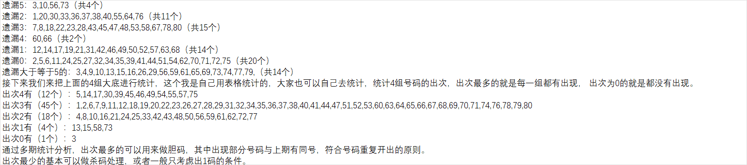 如果把对数和补数合起来有40个号码,中间可能还会产生一下重复数,通过近几期的统计分析,以上期数据进行补数对数计算推算下一期的概率不高。为提高概率,我主要是用前两期的数据来进行对数补数推算,然后再组成一个集合,作为我的第四组大底号码。