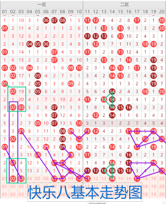 我们先来看一区走势,首先看的就是空一走势的02形态号,03的三斜连,02 03可做二连,07 08的二连形态复制走势,2选1或者直接复制做二连,10 的夹号复制形态,上期1头开出了6连号,并且开出了7枚开奖号,本期我们可以考虑偶数连号,奇数连号或者同路三码,例如图中的11 14 17.