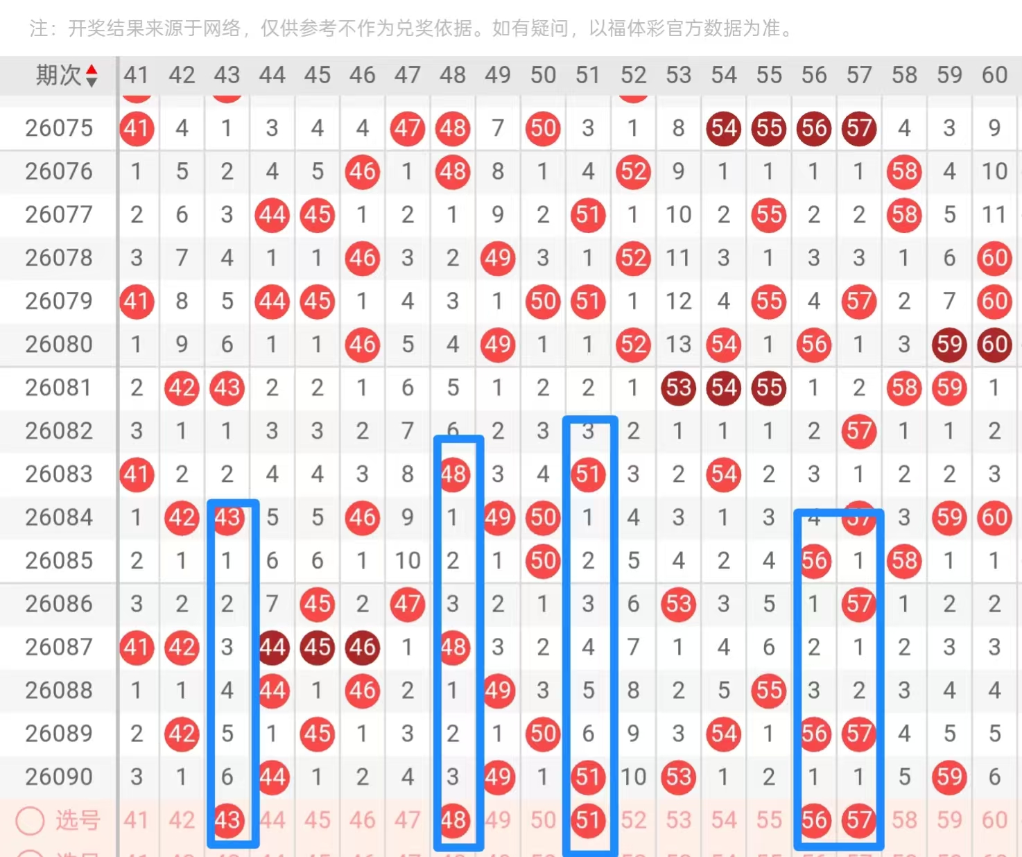 三区41—60:4字头龙头位置本期关注斜连的43号,因为盘上的四斜连并不是说只有一个有多码对位情况下的话,可以考虑二下一然后梅一花有一边走三斜连48的风险可能会更小一点,而且48是一个三三形态整体走势是不错的,49 59同开关联码56 57有一码的概率比较高这两码只能取其一,如果说5号正中间大家不拿可以关57的形态补位。