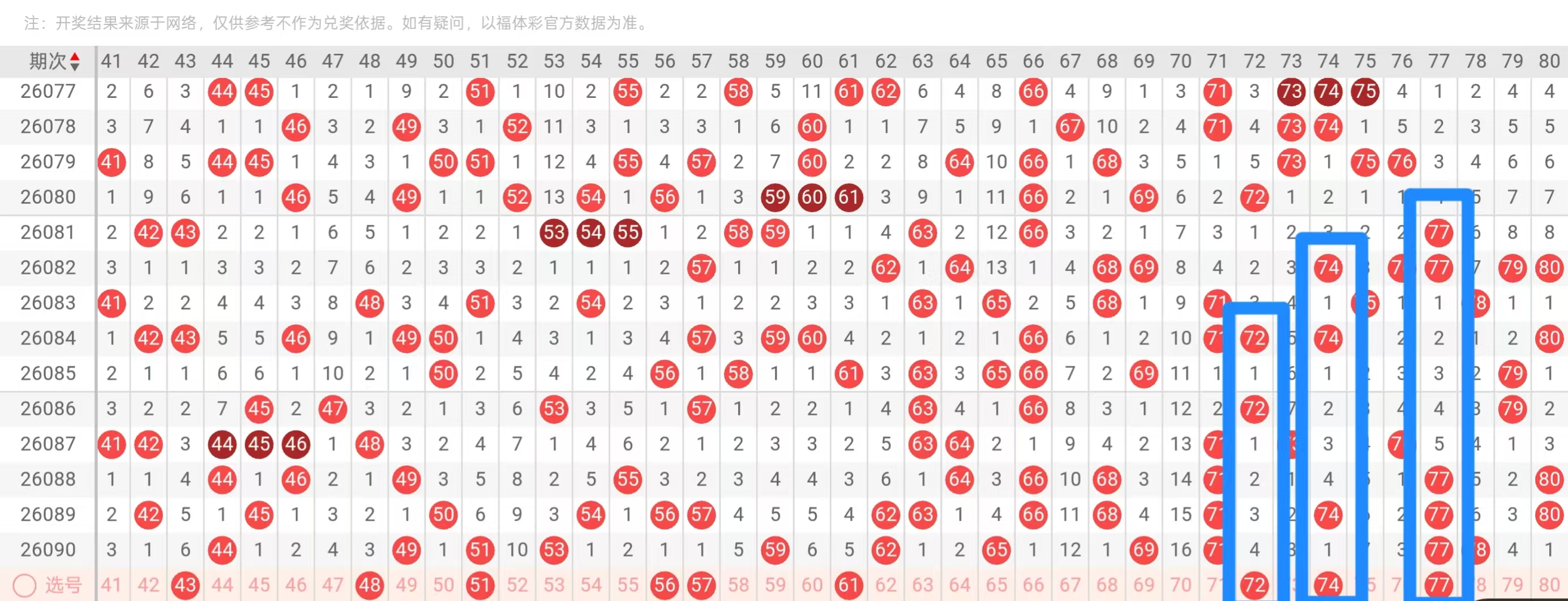 四区61-80:上期的四区出现了一个明显的特征点,就是重码还是没有断,但是也出现了两个大重!本期这两个大家可以去考虑一个继续上楼,然后后面有两个四期遗漏,那么本期的72可以搭配74,近期71 77中间没有组的号,给的更多的都是74号四区的6字头,本期的下号点不太明确,也是个人觉得最绕的一个区间,需要大家重新去考虑这个点位的落号情况不一定要去做号。