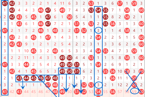 该区间的6连号43 44 45 46 47 48上期落下了47 48,那么本期的43 44 45 46我们就要注意落号了,重点关注43 45的落号情况。48号是属于倒三角啥,可以关注一下。三连号49 50 51遗漏了2期,本期我们可以关注一下落号情况,出一个应该是没有多大问题。中心对称号码58 60号我们要注意落号情况,如果58 60号数字不出,那么59号数字出号情况就大了。
