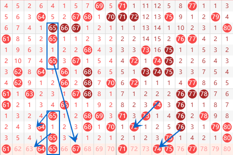 该区间的61号数字我们要注意一下,出号机会还是有的。64 65这里可以关注一下,出一个号码的可能性很大。69 71本期我们也是要关注的,本期做一下防守。74号数字是属于三斜连,本期我们也是可以关注一下的。