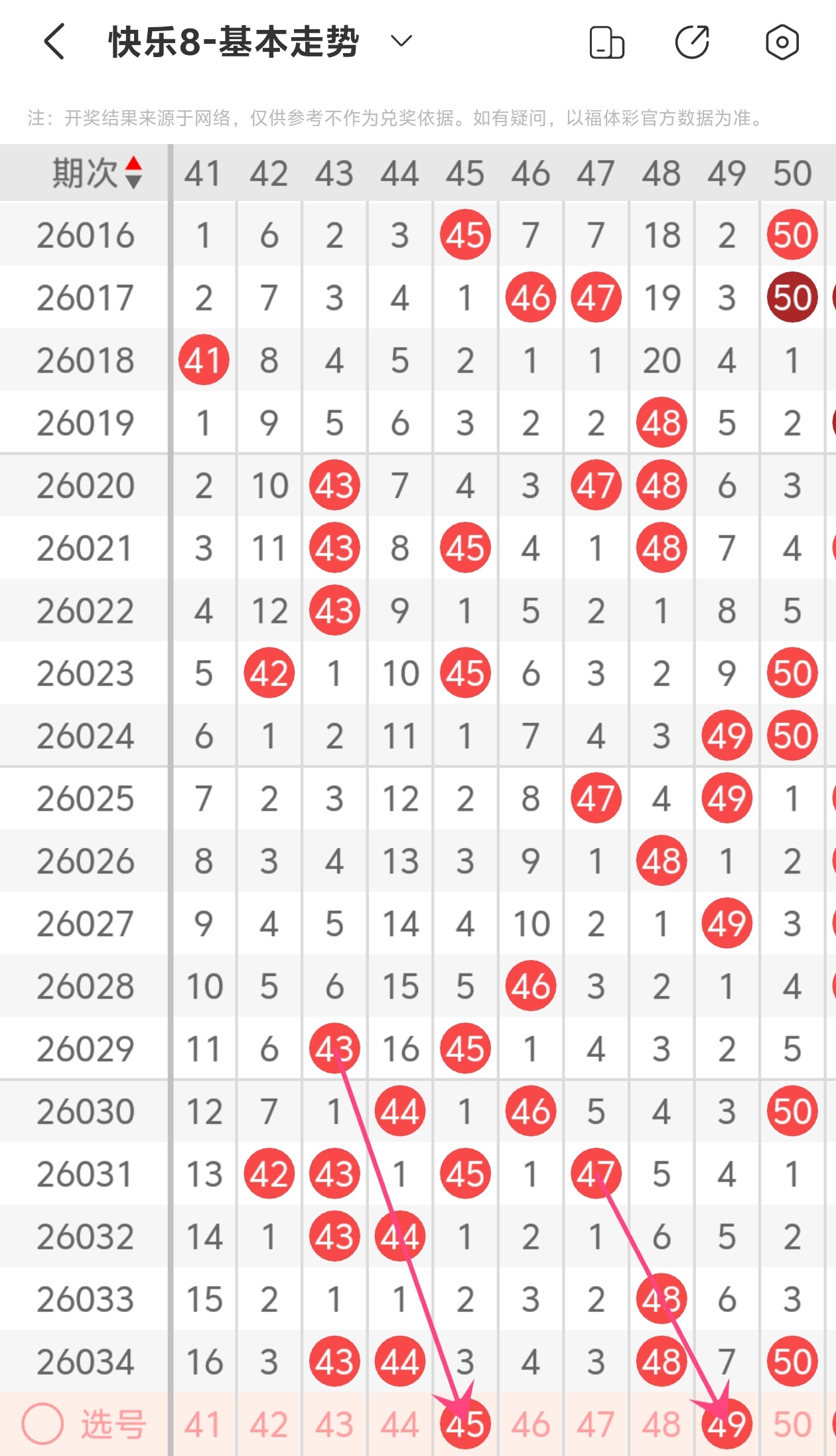 上期第五区间开出43 44 48 50,45为斜连走势,49为斜连走势,本期推荐45 49