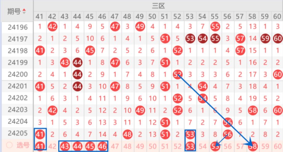 下图为41-60号数字区间走势分析图: