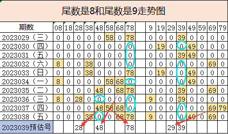 尾数9上期开出3个号码,号码39空期走势很有优势,在029期开出39间隔一期