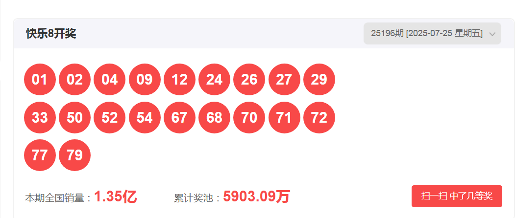 一、快乐八2025196期开奖号码