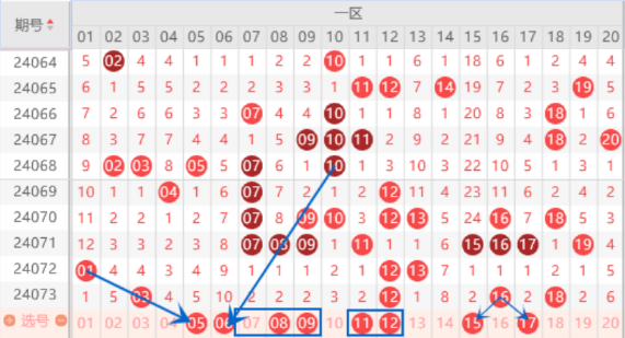 本期的05 06号数字我们注意一下出号情况,最好是做一下防守,这里不一定会出号码。三连号07 08 09号数字本期我们要注意落下号码的情况,重点关注一下08 09号数字出一个号码的情况。本期的11号数字我们关注一下,是属于三斜连号码。本期的15 17我们注意出一个号码的情况,期中的17号数字是属于1路号码,断号2期了,本期是有机会出一个号码的,所以本期的17号数字可以重点关注一下。