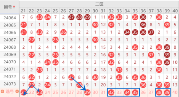该区间的23号数字我们注意一下出号情况,本期是属于夹号类型,本期的夹号有6个,出2个的机会是有的。本期的29号数字我们也是可以关注一下,前面有27 28 29三连号,本期的27 28 29是属于三斜连号码,出号机会还是有的。本期的32号数字是属于,空三对称号码,出号机会很大,我们重点关注一下。本期的31 34 37号数字是属于1路号码,遗漏4期了,本期是有机会出一个号码的,重点关注一下34号数字的出号情况。上期开出了36 38 39号数字的连号空一带号,本期我们要注意出一个重号的情况,重点关注一下38 39号数字的重号。