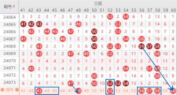 本期的48号数字我们注意一下出号情况,从双码图上看走势,出号机会是很大的。上期开出了52 53 54号数字,本期我们注意一下出重号的情况,重点关注一下52 53出一个重号的情况。本期的56 57 58号数字我们注意一下出号情况,这里最少有一个号码,可以重点关注一下。本期的55 59 60号数字我们要注意出一个号码的情况,重点关注59 60号数字出一个号码的情况。