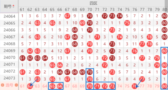 本期的62号数字我们防守一下出号情况。本期的65号数字我们注意一下走重的情况,可以防守一下65 66号数字同出的情况。五连号上期开出了67 70号数字的重号,本期我们注意一下出一个三重的情况,重点关注一下70号数字出三重的情况。本期的71号数字我们关注一下出号情况,最近69 70 71号数字的三斜连出的比较多,本期出号机会也是有的。本期的73号数字我们也是可以关注一下出号情况。本期的80号数字是属于空一对称号码,本期我们也是可以关注一下。