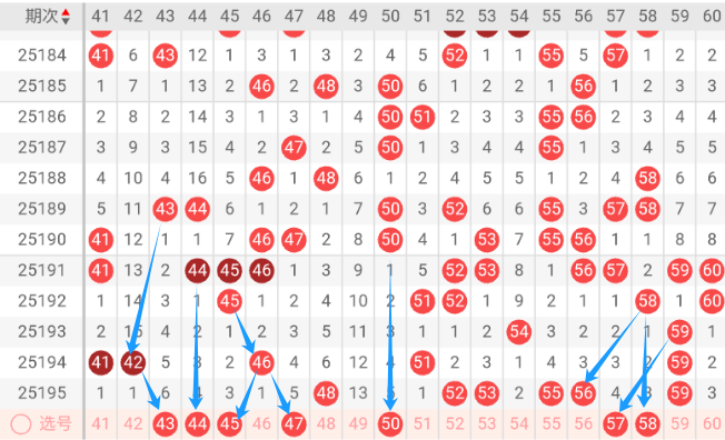 上期当前区段开出6个号码球,再结合前5期出号情况来看当前区段落号率在上升,因此半段本期当前区段出号可能在5个以下,我们再来看下边码,193期开出59边码号,194期没有开出边码号,195期开出52边码号,跟据近几期来看 ,基本每期都会开出1到2个边码号,因此判断本期当前区段可能存在1个以上边码号。再来看看重叠号,最近10期都有重叠号码开出。本区段建议保留1到2个号码作为重叠号。接下来看当前区段连号,最近10期基本都有出现连号,上期本区段开出52.53.55.56连号,本期建议关注43-47之间可能开出连号。本区段重点关注遗漏数据1-4之间号码。