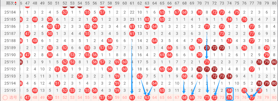 上期当前区段开出4个号码球,再结合前5期出号情况来看当前区段落号率下降,因此半段本期当前区段出号可能在4个以上,我们再来看下边码,193期开出73边码号,194期没有开出边码号,195期开出65边码,跟据近几期来看 ,基本每期都会开出1到2个边码号,因此判断本期当前区段可能存在1个以上边码号。再来看看重叠号,最近10期都有重叠号码开出。本区段建议保留1到2个号码作为重叠号。接下来看当前区段连号,最近10期基本都有出现连号,上期本区段没有开出连号,本期建议关注68-74之间可能开出连号。本区段重点关注遗漏数据2-6之间号码。