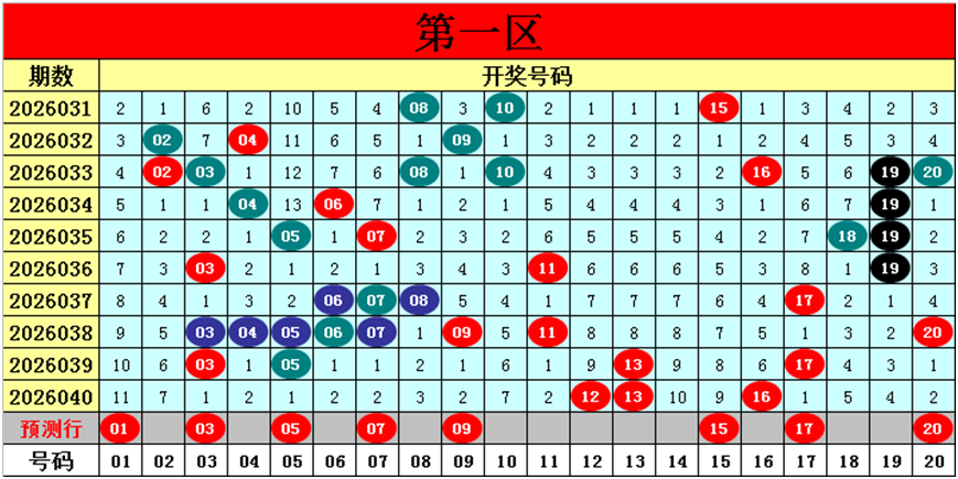 目前第一区包含12个热码:重码3个12、13、16,邻码2个11、17,孤码7个03、04、05、06、07、09、20;包含3个温码:邻码0个,孤码3个08、18、19;包含5个冷码:邻码2个14、15,孤码3个01、02、10;号码冷温热个数比为5:3:12,重号、邻码、孤码个数比为3:4:13。