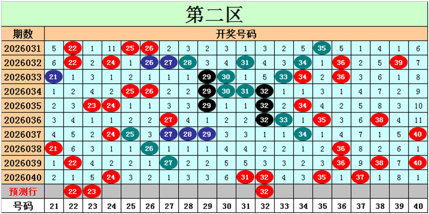 目前第二区包含12个热码:重码5个24、31、32、35、37,邻码3个36、38、40,孤码4个21、22、26、27;包含7个温码:邻码5个23、25、30、33、34,孤码2个28、29;包含1个冷码:邻码0个,孤码1个39;号码冷温热个数比为1:7:12,重号、邻码、孤码个数比为5:8:7。