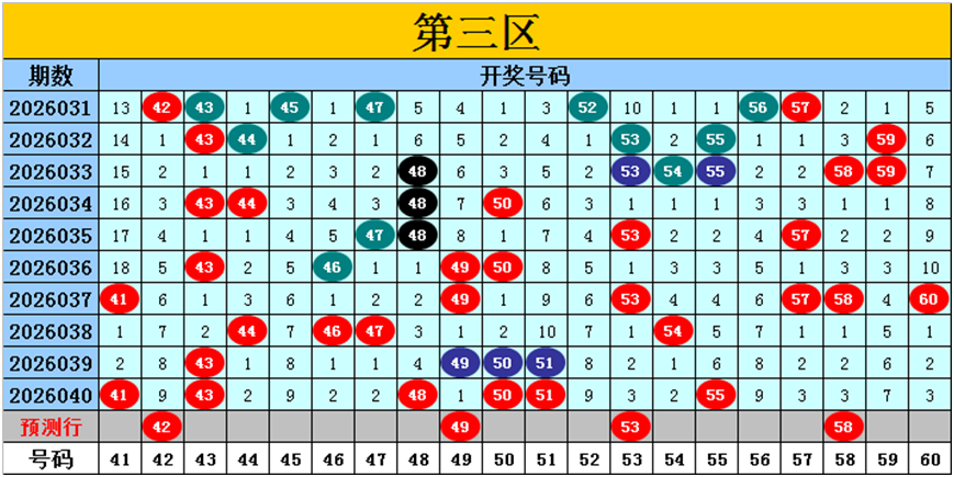 目前第三区包含11个热码:重码6个41、43、48、50、51、55,邻码4个44、47、49、54,孤码1个46;包含4个温码:邻码0个,孤码4个53、57、58、60;包含5个冷码:邻码3个42、52、56,孤码2个45、59;号码冷温热个数比为5:4:11,重号、邻码、孤码个数比为6:7:7。