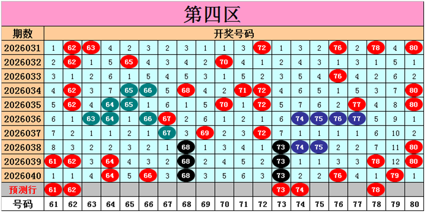 目前第四区包含12个热码:重码6个64、66、68、73、76、79,邻码4个74、75、78、80,孤码2个61、62;包含8个温码:邻码6个63、65、67、69、72、77,孤码2个70、71;包含0个冷码;号码冷温热个数比为0:8:12,重号、邻码、孤码个数比为6:10:4。