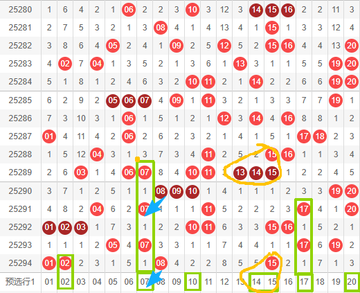 本期一区女神推荐号为:02. 07. 10. 14. 15. 17. 20。 近15期内15是热号,15期内出现7次,其中有一个三直连,如图,前几期开出15时,次期开出13.14.15三连号,本期推荐14.15双联号。07和17如图,近几期内都是隔一期出一次,隔一期,出一次,按照规律,07和17都隔了一期,本期女神推荐07和17,10和20都是温热号,可以作为备选。01和02上期开出双联号,02本期连出可能性很大,推荐备选。