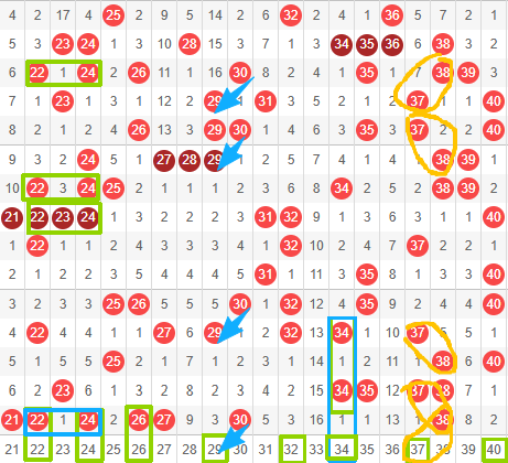 本期二区推荐号为:22.24.26.29.32.34.37.40。本期二区推荐号较多,所谓买热不买冷,上期二区开出7个号,女神本期也重点推荐二区号码,我们来逐个分析,首先是推荐号22和24,如图,22和24在近15期内多次同时开出偶连号,上期也是同时开出,女神推荐,本期22和24直连,继续开出。26是女神个人比较喜欢的号码,作为参考即可,29和30经常出斜连号,如图,近15期内出现了三次左斜连,上期开出30,按照概率来讲吗,本期29作为重点推荐,可能性非常大。32和34属于温号,32近15期内开出5次,34近15期内开出4次,作为备选即可。37和38跟29和30很相似,经常斜连出现,如图,37和38近15期内已连续出现4次斜连号,上期刚刚开出38,本期37也可作为重点号码。40是女神个人认为本期该出了,不作为重点推荐,备选即可。