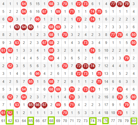 首先我们看下上期数据,和值为710.  奇偶比例为:8:12.  偶数偏多。  出了五组双连号,分别是01+02,21+22,  26+27,45+46, 61+62.。 还有三个直连号,分别是38,41和46。 其中38是三期直连,41和46是两直连,我们把 01-40划分为前区,41-80划分为后区,则小号偏多,本期未开出冷号,均为热号和温热号或温冷号。