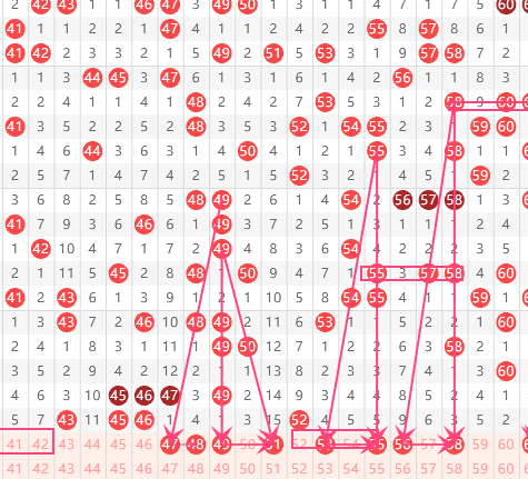 三区分析:【41-60】(走势图标注号码非小黄车大底,请谨慎参考,具体思路上期三区间开出了4个号码,连续两期开出4码出号防止3区的突然回暖,首先空位3连码成功的判断出走重码,胆5头就回补了一个空位温冷52号球,本期首先考虑的就是空位温冷的接力,54 55 56 57 59 5选1其次在43 45 46假4连下方做号,其次就是空位小周期的回补。以上就是3区的区间布局思路大家参考.