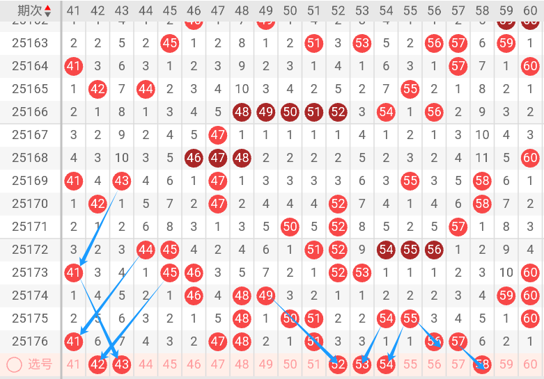 上期当前区段开出6个号码球,再结合前5期出号情况来看当前区段落号率在上升,因此半段本期当前区段出号可能在5个以下,我们再来看下边码,173期开出46.53边码号,174期开出59边码号,175期开出50边码号,172期开出47.56边码号,跟据近几期来看 ,基本每期都会开出1到2个边码号,因此判断本期当前区段可能存在1个以上边码号。再来看看重叠号,最近10期都有重叠号码开出。本区段建议保留1到2个号码作为重叠号。接下来看当前区段连号,最近10期基本都有出现连号,上期本区段开出47.48.56.57连号,本期建议关注52-58之间可能开出连号。本区段重点关注遗漏数据1-3之间号码。