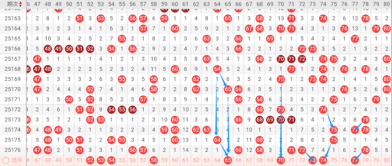 上期当前区段开出5个号码球,再结合前5期出号情况来看当前区段落号率在上升,因此半段本期当前区段出号可能在4个以上,我们再来看下边码,174期开出77边码,175期64.75边码,176期没有开出边码号,跟据近几期来看 ,基本每期都会开出1到2个边码号,因此判断本期当前区段可能存在1个以上边码号。再来看看重叠号,最近10期都有重叠号码开出。本区段建议保留1到2个号码作为重叠号。接下来看当前区段连号,最近10期基本都有出现连号,上期本区段开出71.72连号,本期建议关注70-74之间可能开出连号。本区段重点关注遗漏数据4-7之间号码。