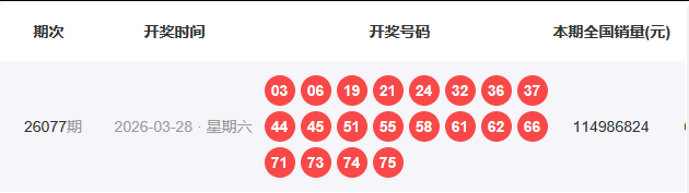 1、开奖号码:03 06 19 21 24 32 36 37 44 45 51 55 58 61 62 66 71 73 74 75